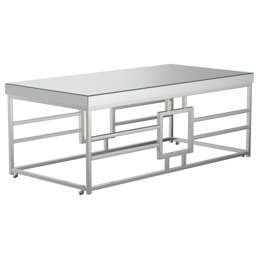 Enjoy coffee in your contemporary space with this coffee table. Pay homage to modern design with this classy mirrored tabletop. Gaze upon the architecturally-inspired geometric design. Metal frame in a chrome finish combines strength and beauty. Casters allow you to move this coffee table at-will to set up your desired look.