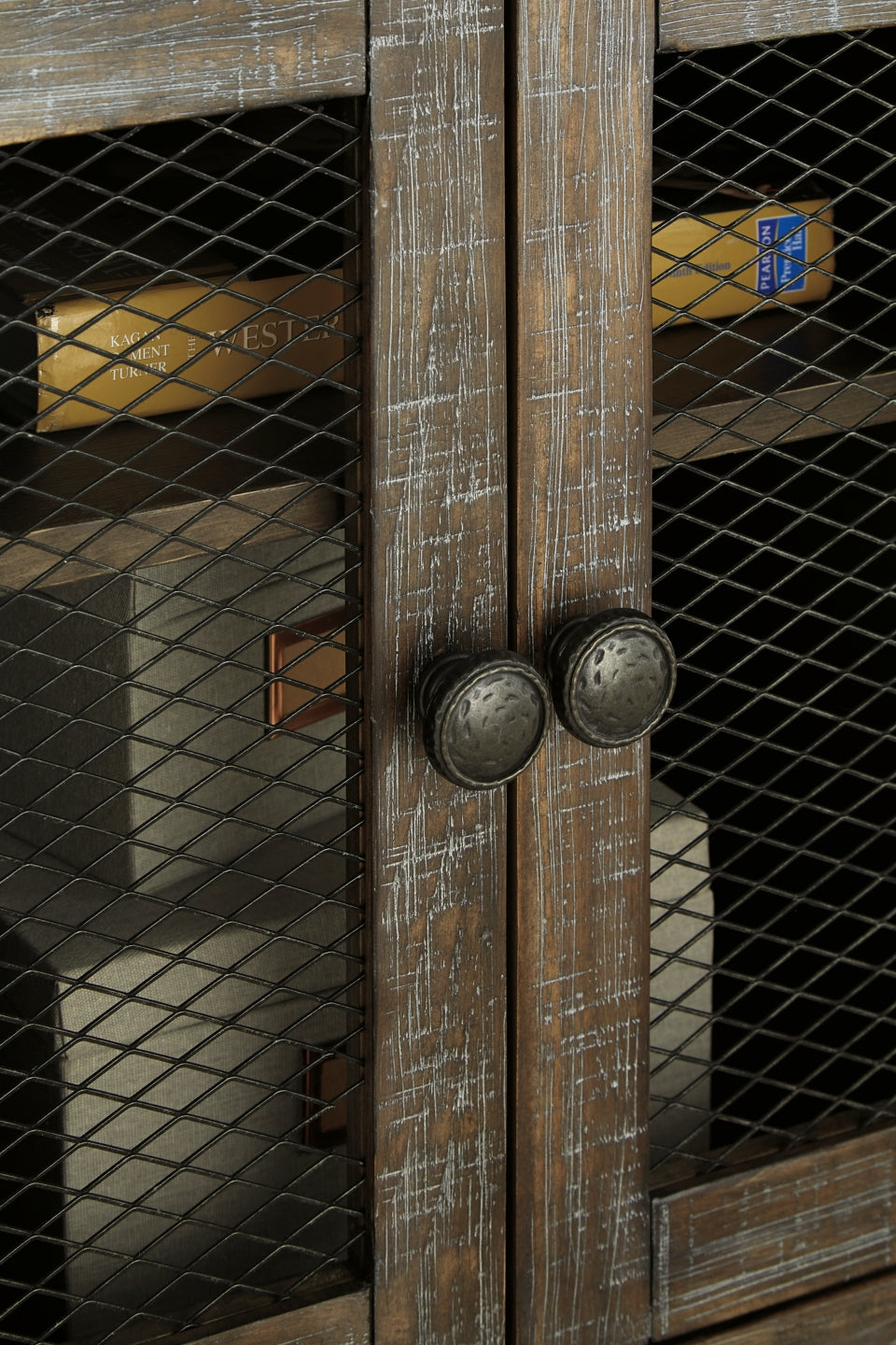 This occasional table set is so much better for the wear. Its clean, straightforward profile is enriched with solid pine wood treated to a complex finish melding gray and brown hues. Sporting iron-tone industrial brackets and wire mesh cabinet doors, it’s loaded with charm and packed with possibilities.
