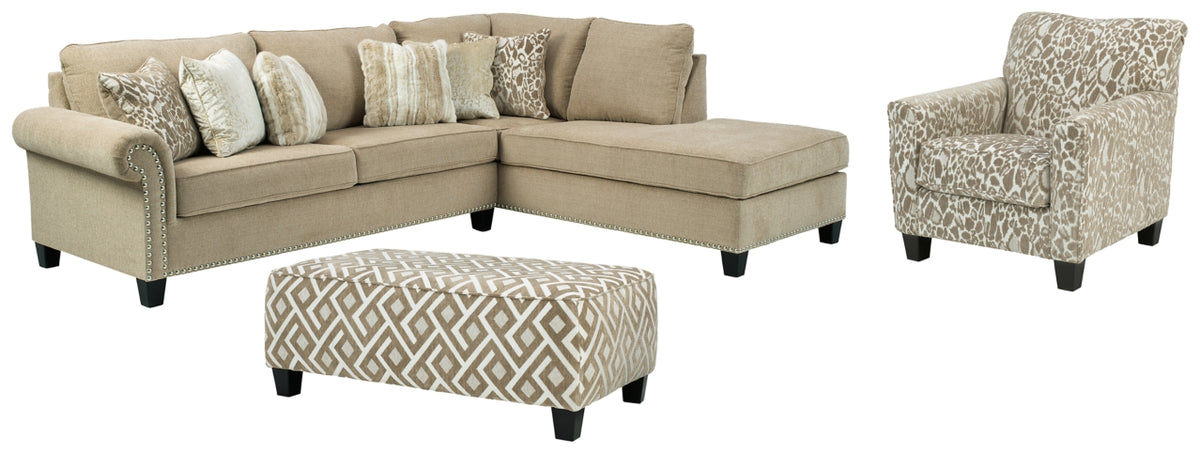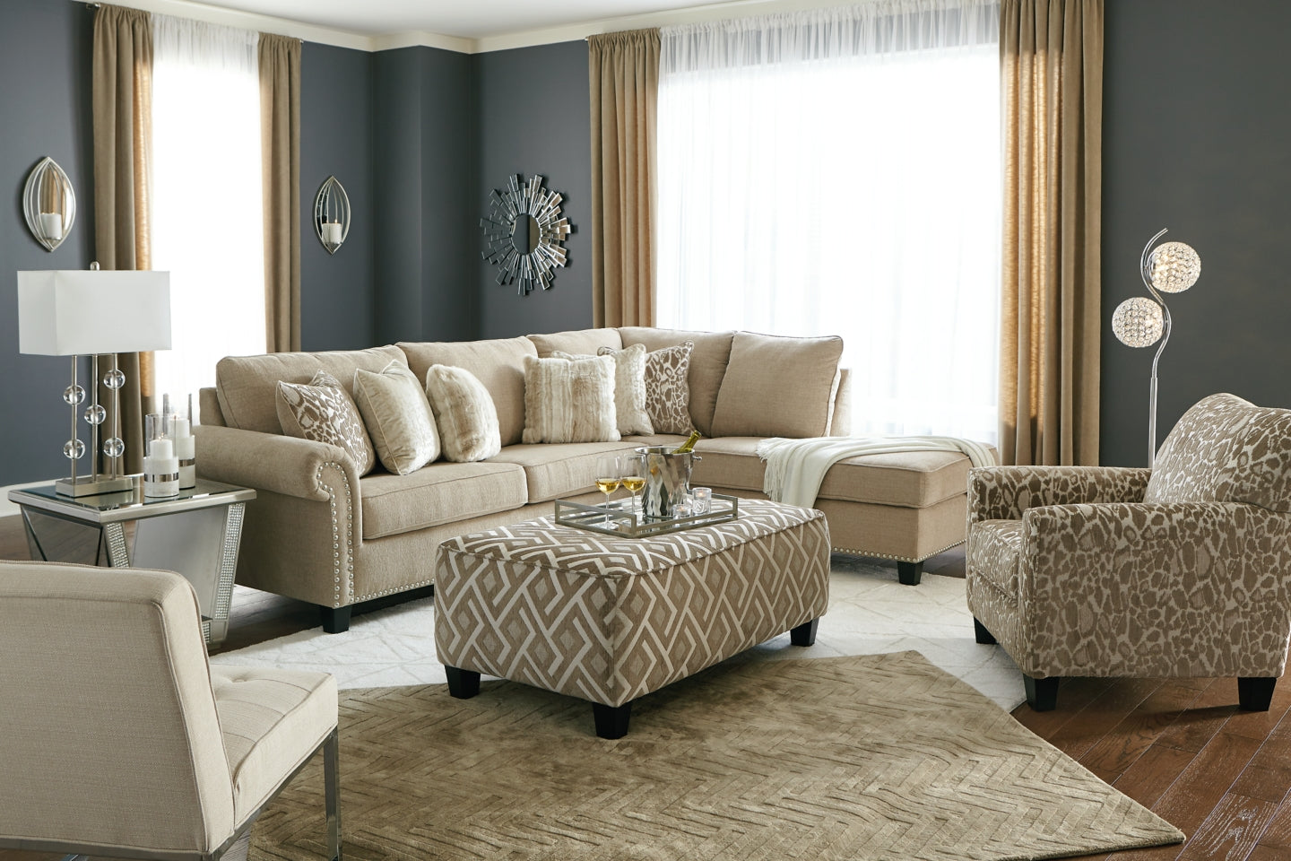 Enticing in chic and sophisticated putty for a look of everyday luxury, the Dovemont 2-piece sectional with ottoman simply says, “You’ve got great taste.” Elements that bring in just enough glam include pewter-tone nailhead trim and fanciful roll arms that beautifully go with the flow. Textured cheetah print, fur and crushed velvet throw pillows incorporate fabulous sheen and shine.