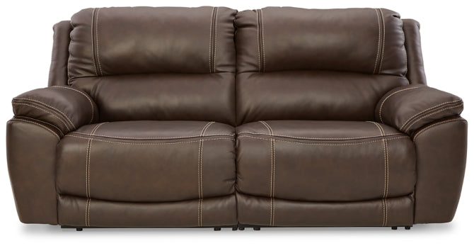 Load up on comfort in a cool, clean-lined and contemporary way with this power reclining loveseat in chocolate brown. Rest assured, the leather match upholstery is enriched with a pebble grain effect for authentic appeal and enhanced with jumbo stitching for dramatic contrast. It features a one-touch power control with adjustable positions, along with an Easy View™ adjustable headrest that allows a primo view of the TV even when you're reclined. Extended ottomans provide extra length for leg comfort. A zero-draw USB plug-in at your fingertips lets you charge up as you chill out.