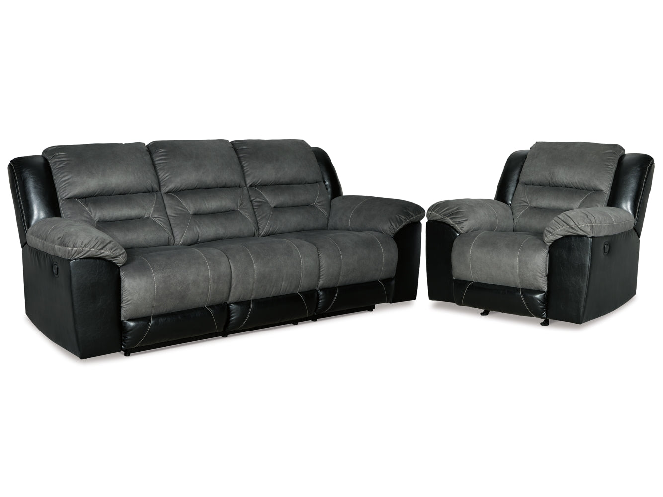 Every day is a good day with this recliner and sofa package around. Take a load off and forget your worries as you ease back into the luxurious feel of suede-like fabric. Faux leather covers the outside parts for an elevated look. Need more comfort and support for your body? Cue the deep seating and tall backs. Contrast jumbo stitching adds an element of style to the cushions.