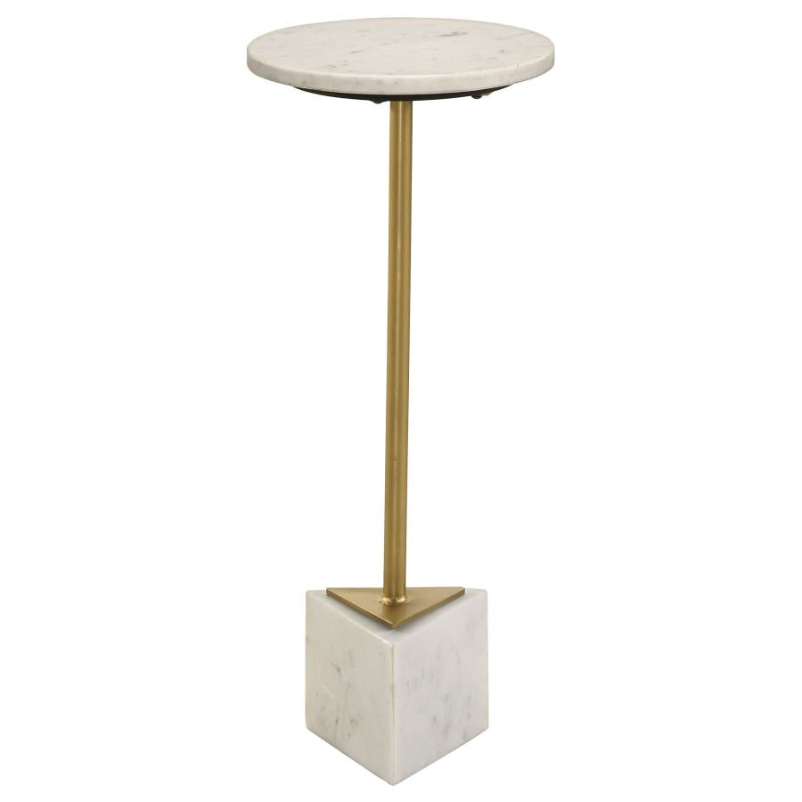 With a glam-inspired style reflecting the best of casual décor, this accent table turns your living room or family room into a study of modern architecture with a hint of old world glam. Bold shaping is both contemporary and optically pleasing. Intriguing geometric elements blend a round white marble top and matching triangular base, offering a chic silhouette. A gold finish metal pedestal and base top give your space an extra dose of gleaming warmth. Choose this table to serve cocktails and drinks, or put it to good use as a decadent display space for greenery.
