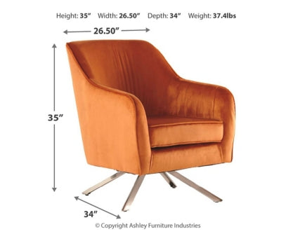 Today’s casual lifestyles call for updates to familiar profiles. This swivel chair is a refreshing take on mid-century seating. Upholstered in an utterly on-trend rust colored velvet, this barrel-backed beauty keeps you right in the swing of things. Chrome-tone canted legs blend mid-century and modern design with ease.