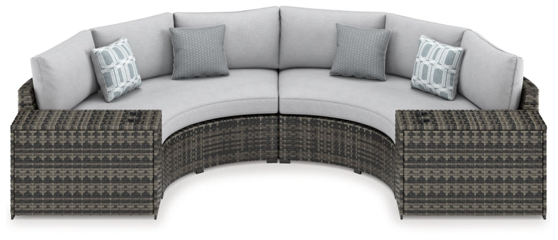 This cool, casual seating set will raise the comfort level and visual appeal of your outdoor living area. Made with handwoven wicker in neutral tones of light and dark gray, the curved loveseats blend beautifully into your lanai or pool and patio area. The thick, comfy cushions are wrapped in Nuvella® high-performance fabric that is stain-resistant, fade-resistant and easy to clean. Two pillows are thrown in for added comfort and a splash of color. Rounding out the set, the matching consoles each feature a pair of drink holders to accommodate you and a guest. What a way to create a space that holds up to Mother Nature and ages gracefully for years of enjoyment.