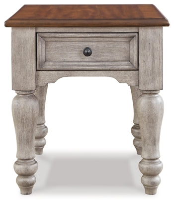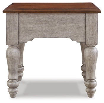 This end table offers understated beauty with its traditional cottage design. The outstanding two-tone finish features an antiqued gray body with a rich deep walnut brown top. Artfully turned legs add a touch of character, further enhancing the table's simple sophistication.