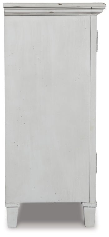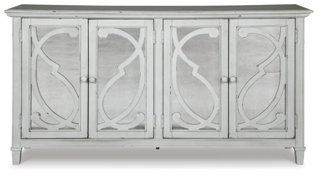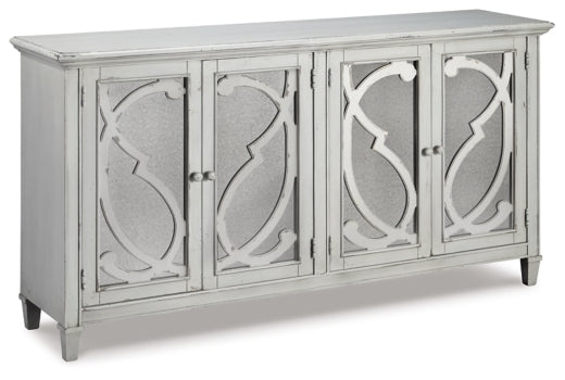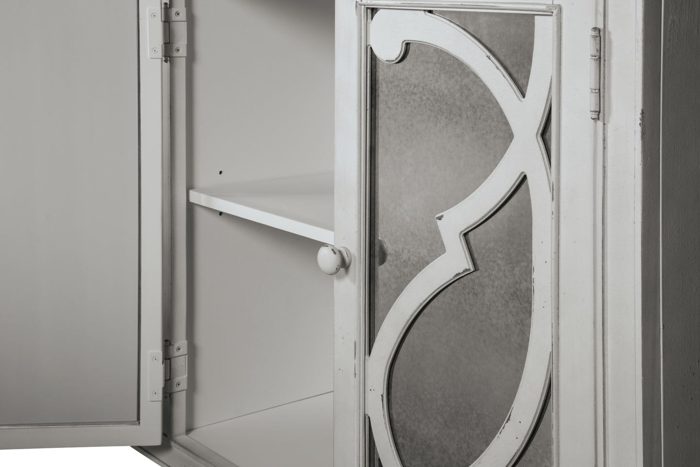 With its distressed finish made to look like fabulously faded antique white paint, this cabinet is an eclectic piece that beautifully suits so many spaces, including the dining room, living room and entryway. Ornately scrolled filigree front doors with mirrored glass inlays are a reflection of your fine taste and stylish flair. Adjustable shelving enhances its form and function.