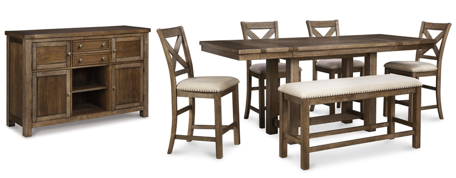 This counter height dining table set with upholstered bar stools, upholstered bench and server elevates the art of casual rustic style. Notable refinements include through-tenon touches, plank-effect tabletop and distressed nutmeg finish that’s warm and welcoming. The table's space-efficient scale is especially suited to loft-style living, but two optional leaves ensure plenty of space for parties up to eight. Abundantly practical server serves your storage needs with an easy elegance.