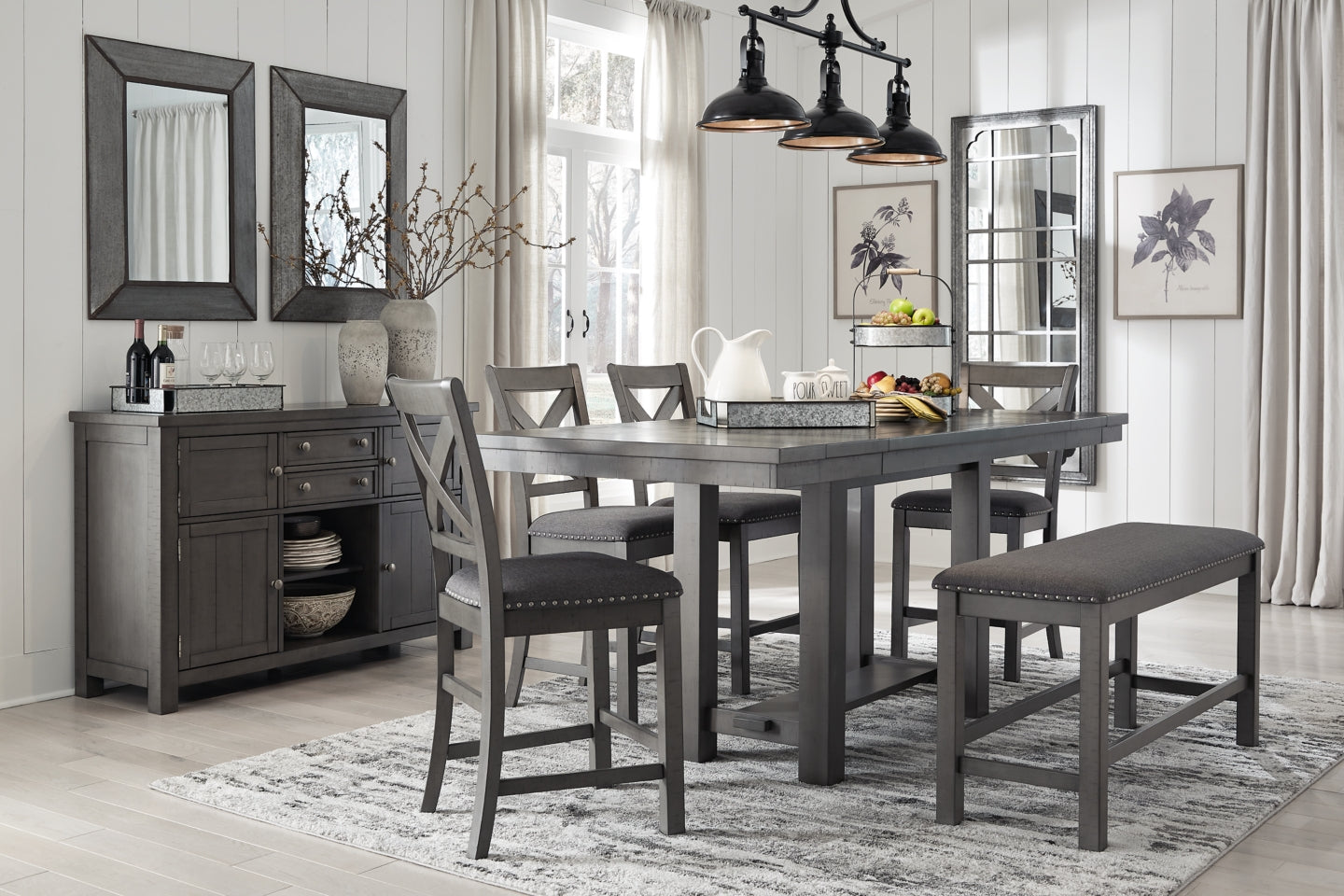 Going gray in the best possible way. This dining package wows with an utterly on-trend smoky gray finish. Just a touch of distressing helps it fit right in with your modern farmhouse decor.