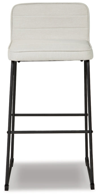 Why not give yourself two more reasons to linger at the table a little longer? Serve up an ultra-contemporary look at a comfortably cool price with this low back bar stool set. This set of two sleek yet sturdy bar stools includes black tubular metal legs, comfortably cushioned seats wrapped in a white woven upholstery and distinctive horizontal channel tufting for a deliciously upscale aesthetic.