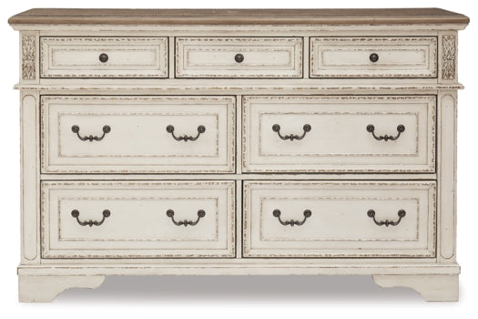 Elevating the art of traditional cottage styling, this dresser is your dream bedroom retreat realized. Its antiqued two-tone aesthetic blends a chipped white with a distressed wood finished top for added charm. Framed drawer fronts and decorative corbels add refinement, while bail pulls in a dark bronze-tone finish lend a classic touch.