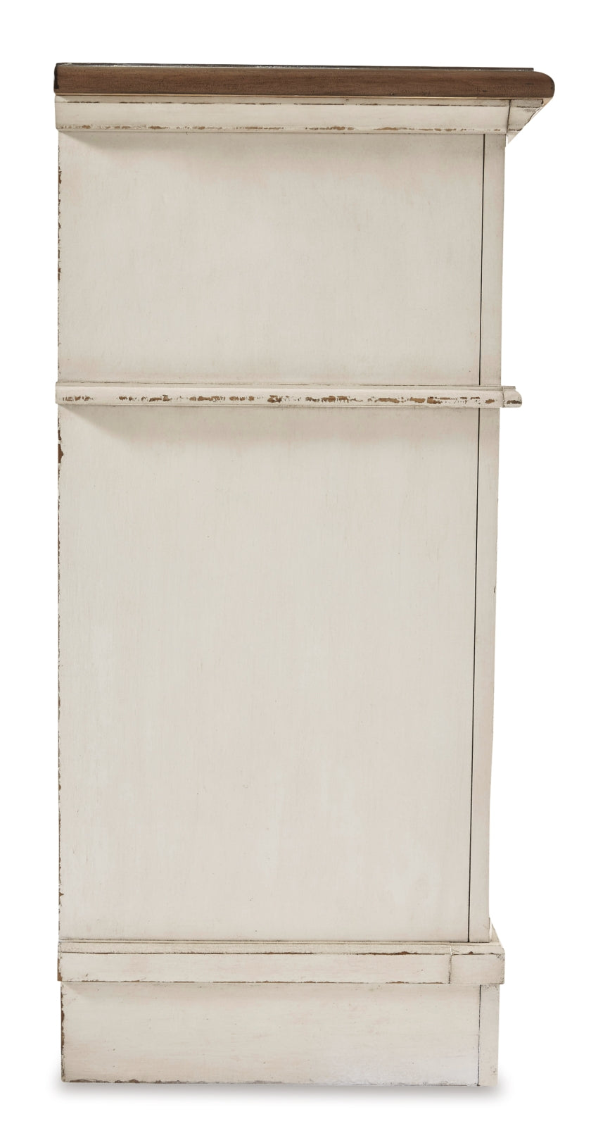 Elevating the art of traditional cottage styling, this dresser and mirror set is your dream bedroom retreat realized. This brilliantly crafted bedroom ensemble wows with dramatic scalloped details and an antiqued two-tone aesthetic, blending a chipped white with a distressed wood finished top for added charm. Framed drawer fronts and decorative corbels add refinement, while bail pulls in a dark bronze-tone finish lend a classic touch.