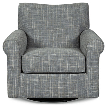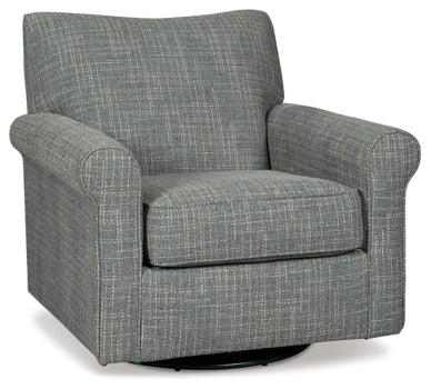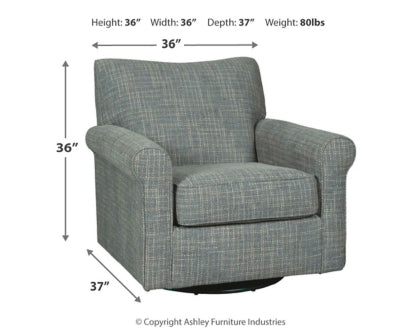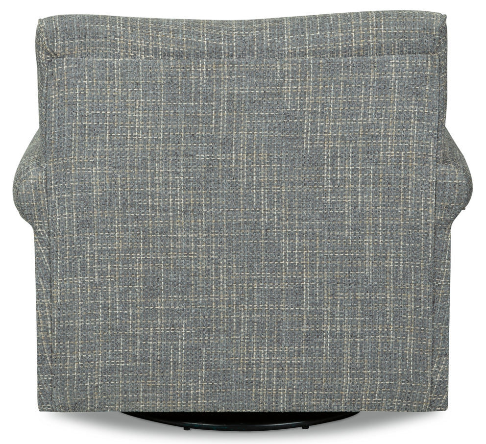 Sporting a tantalizing tweed weave fabric in such a soothing blue hue, this swivel glider accent chair gives the classic roll arm chair a modern twist. Smooth, 360-degree swivel caters to your comfort—and your viewing pleasure. Gentle glider feature is designed to rock your cares away.