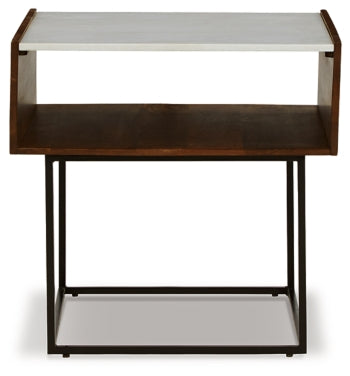 A posh and polished look for a contemporary aesthetic, this striking end table features solid mango wood, a natural marble tabletop and a slim metal base. Designed with an open cubby shelf for extra storage, this beautiful table easily complements modern seating arrangements.