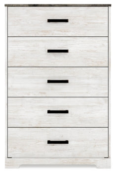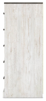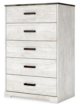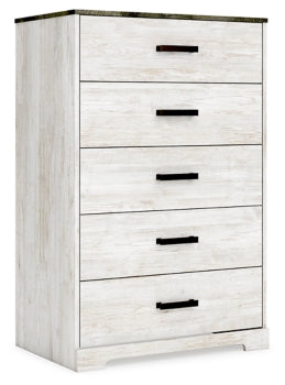 Give provincial a new meaning with the chic look of this chest of drawers. A two-tone finish keeps this piece light and fresh, while the warm pewter-tone hardware adds an industrial touch. The distressed whitewashed body adds a delightfully homespun charm to your space.