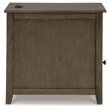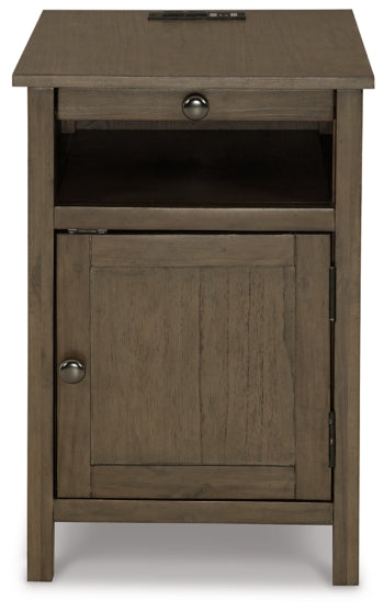 Add big character to a small space with this chairside end table. With its compact size and strong silhouette, it can go anywhere and blend easily into the decor. Less is so much more with the Shaker-inspired design and grayish brown wood tone finish. Loaded with form and function, this end table displays accent pieces and stores essentials securely while keeping devices powered up.