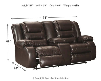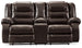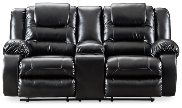 When it comes to comfort, style and value, this faux leather reclining loveseat in black rocks. Tailored for feel-good flair, its fashion-forward bustle back design is enhanced with sculpted padding on the headrest for cradling support. Channel cushioning along the sides flows into thick, wrapped pillowtop armrests that are truly over the top. And while it might look like you broke the bank, a sumptuously soft leather-like fabric keeps indulgence well within budget.