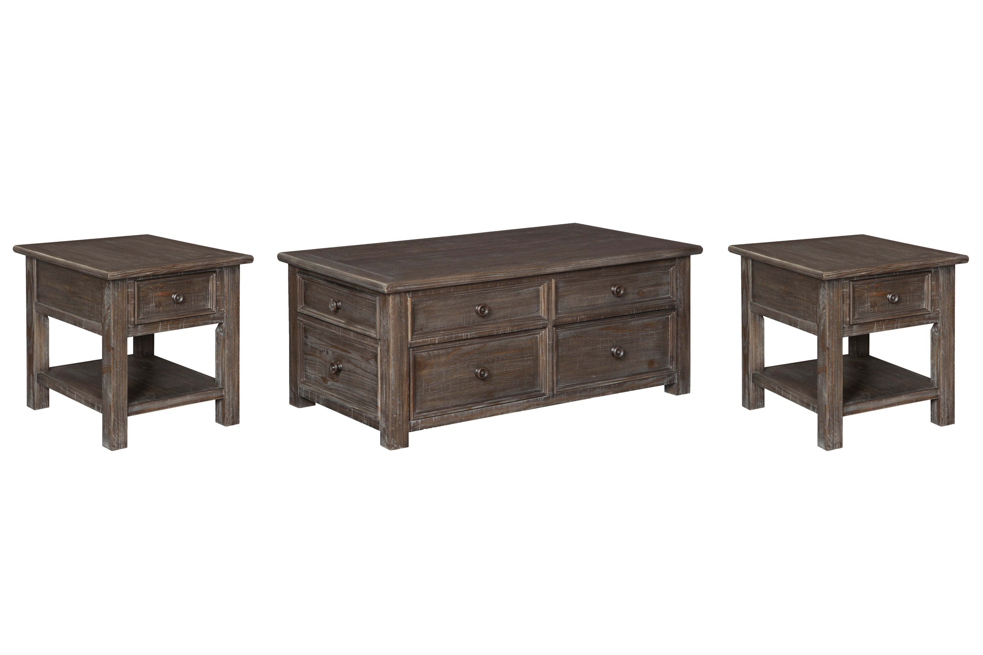 Inspired by heavy and hearty lodge-style furnishings from days gone by, this occasional table set brings the past brilliantly into the present. Distinctive details include robust mouldings, raised drawer fronts for rich dimension and a distressed aged pine color finish with light wire-brushed texture that’s pure artistry.