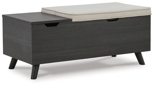 The clean profile of this small storage bench makes an entrance anywhere and everywhere you place it. Replicated blackened wood finish with a grayed textural grain and tapered wood legs lend a fresh flair. Adding form and function, both tops are removable to expose hidden storage underneath. A must-have piece for small spaces.