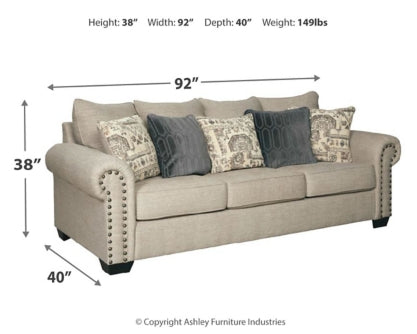 This sofa and loveseat let you make a high-style statement at a comfortably affordable price. Richly traditional roll arms are given a modern punch care of oversized nailhead trim in a black nickeltone finish. Linen-weave upholstery in fresh and clean sandstone beige is complemented designer pillows that add texture and sophistication.